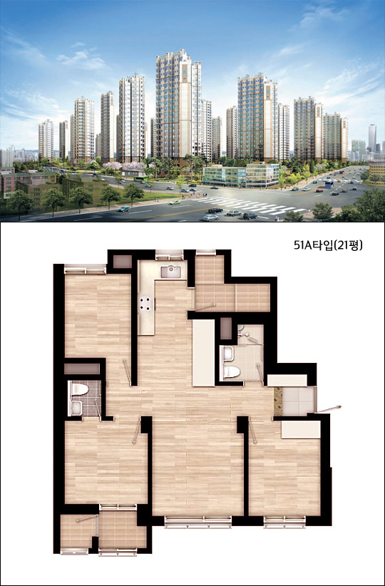 또한 전용면적 69.42㎡(구21평)의 경우 2억 후반대로 구입이 가능하며, 소형 평형임에도 넓게 빠진 차별화된 구조와 공간설계로 방 3개와 화장실 2개, 그리고 넓은 거실과 주방까지 갖추고 있다.