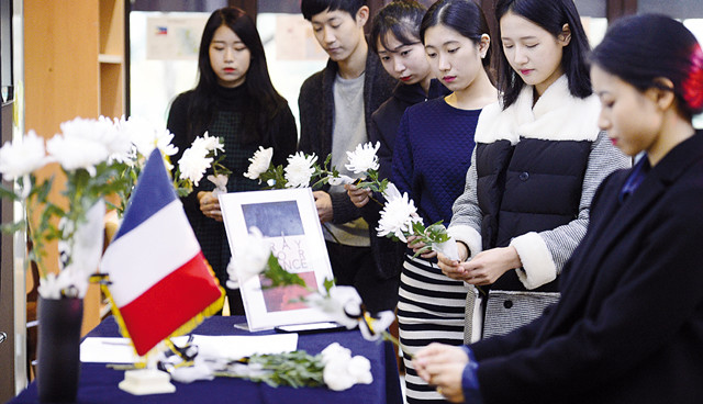 전 세계적으로 프랑스 테러 희생자를 위한 추모 물결이 이어지고 있는 가운데 17일 오후 대구 달서구 계명대학교에 설치된 프랑스 희생자를 위한 합동 분향소에서 학생들이 헌화를 하고 있다.