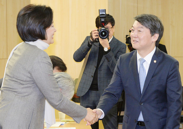 새정치민주연합 안철수, 박영선 의원이 17일 오전 서울 여의도 국회의원회관에서 개최한 ‘공정성장론-공정성장 3법’토론회에서 악수하고 있다.