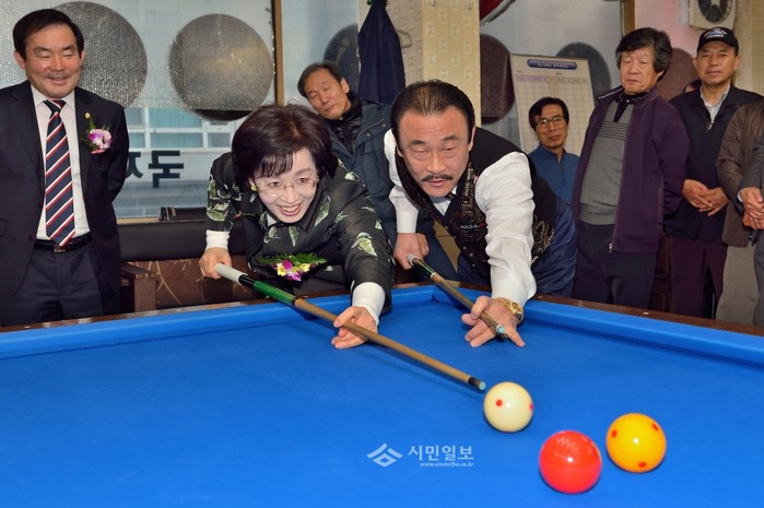 박춘희 송파구청장이 지난 17일 송파구 '력셔리 당구클럽'에서 열린 '제5회 송파구청장배 당구대회'에 참석해 서울시당구연합회 김종석 회장과 함께 시연을 하고 있다.(사진제공=송파구청)