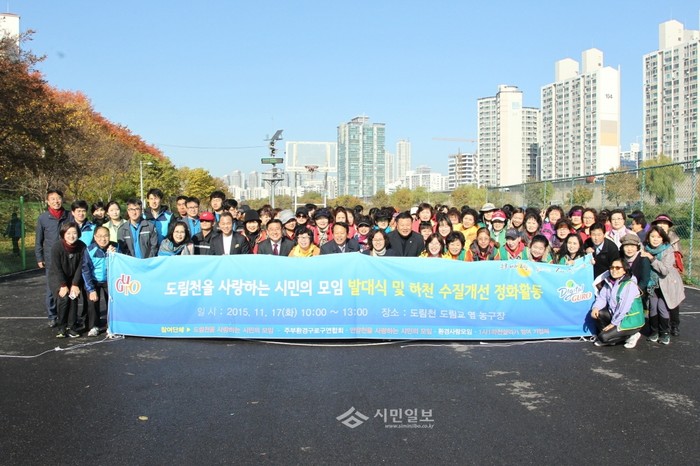 지난 17일 서울 구로구 도림천의 수질보호를 위해 하천정화, 수질모니터링, 하천감시, 환경체험교육 등 다양한 활동을 펼치는 ‘도림천을 사랑하는 시민의 모임’(도사모)의 발대식에 참석한 이성 구청장(가운데)이 발대식 후 함께 기념촬영을 하고 있다. (사진제공=구로구청)