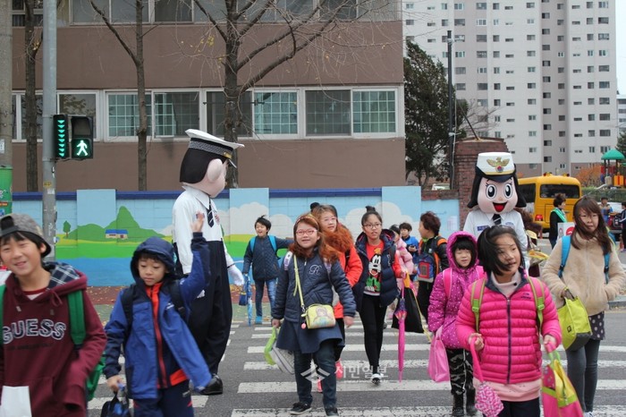 인천중부경찰서는 18일 오전 인천 연안초등학교에서 어린이들의 교통사고 예방 홍보를 위한 '민·관 합동 스쿨존 안전보호 캠페인'을 실시했다. 사진은 등교하는 학생들을 대상으로 캠페인이 진행 중인 모습.(사진제공=인천중부경찰서)