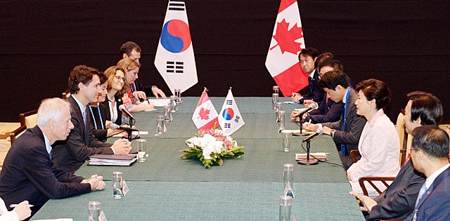 APEC 정상회의에 참석한 박근혜 대통령이 18일(현지시간) 오전 마닐라 호텔에서 저스틴 트뤼도 캐나다 총리와 환하게 웃으며 정상회담을 하고 있다.