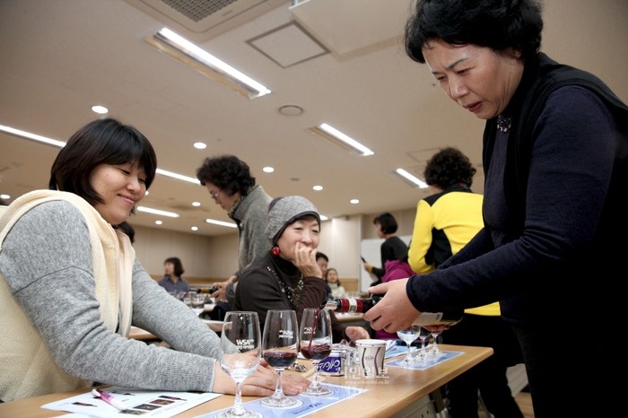 지난 18일 서울 왕십리도선동 행복학습센터에서 와인에 대한 기초 지식과 정보를 주민들에게 제공하기 위해 열린 ‘초보자를 위한 와인아카데미’에 참가한 주민들이 시음을 위한 와인을 잔에 따르고 있다.(사진제공=성동구청)