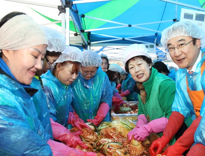 지난 17일 도봉구새마을부녀회와 주부환경도봉구연합회가 도봉구청 광장에서 '사랑의 김장김치 나눔행사'를 개최한 가운데 이동진 구청장이 행사 참가자들과 함께 김장을 하고 있다. (사진제공=도봉구청)