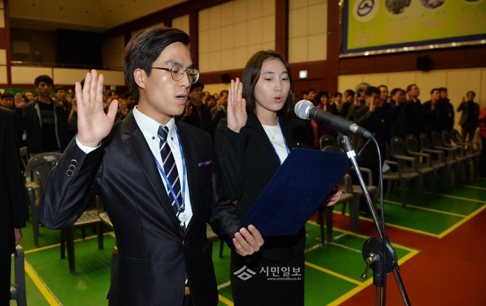 지난 18일 오후 2시부터 서울 동대문구청 대강당에서 열린 '공직자 행동강령 실천을 위한 결의대회'에서 직원 대표 두 명이 결의문을 낭독하며 선서를 하고 있다.(사진제공=동대문구청)