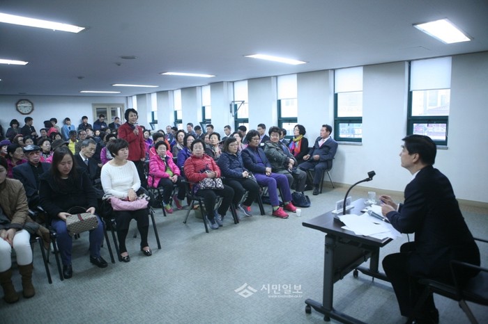 지난 18일 서울 강동구 천호3동 주민센터 회의실에서 열린 ‘동동 현장데이트’에서 이해식 구청장(오른쪽)이 한 주민의 지역현안에 관한 질문을 듣고 있다.(사진제공=강동구청)