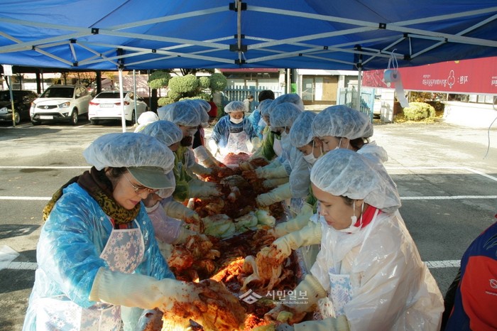 경기 의정부시자원봉사센터는 지난 17일 의정부시자원봉사센터 주차장과 1층 평생학습실에서 '사랑가득·행복듬뿍 2015 사랑의 김장 나눔 행사'를 개최했다. 사진은 행사에 참석한 관계자들이 김치를 담그는 모습.(사진제공=의정부시청)