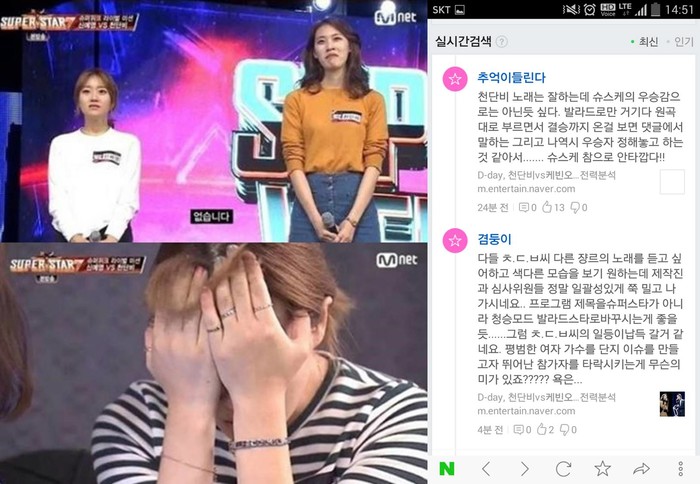 천단비의 ‘선곡 특혜’ 의혹에 누리꾼들은 "우승자 정해놓고 하는 것 같아 안타깝다", "제목을 슈퍼스타가 아니라 청승모드 발라드스타로 바꿔라" 등의 부정적인 반응을 표출하고 있다.