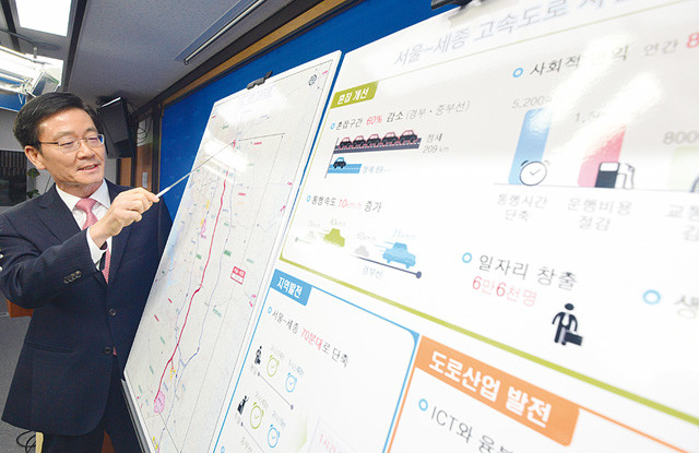 김일평 국토교통부 도로국장이 지난 18일 오후 정부세종청사 국토부 기자실에서 서울-세종 고속도로를 민자사업으로 추진한다고 밝히고 있다. 김 국장은 서울-세종 고속도로는 이르면 2016년 말 착공예정이며 주말은 물론 주중에도 만성적인 교통정체가 발생하고 있는 경부·중부고속도로의 혼잡구간이 60% 정도 감소할 것으로 예상된다고 덧붙였다.
