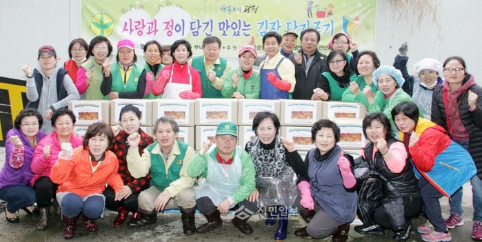 19일 경기 광명1동 주민자치센터에서 열린 '사랑과 정이 담긴 맛있는 김장 담가주기 행사'에 참석한 나상성 의장이 김치를 담그고 참가자들과 함께 기념촬영을 하고 있다.(사진제공=광명시의회)