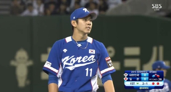 19일 오후 일본 도쿄돔에서 프리미어 12 한국과 일본의 준결승전 경기가 펼쳐지는 가운데 한국의 선발투수 이대은은 일본 타선에 2개의 볼넷을 허용했지만 무실점으로 첫회를 마쳤다.
