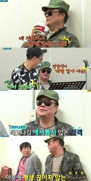 이 말을 들은 남진이 "넌 어쩌면 인간성이 그렇게 개떡같냐. 친구의 허물을 덮어줘야지"라고 나무라자 조영남은 "네가 먼저 시작했잖아"라고 퉁명스럽게 말하며 안방극장을 웃음바다로 만들었다.