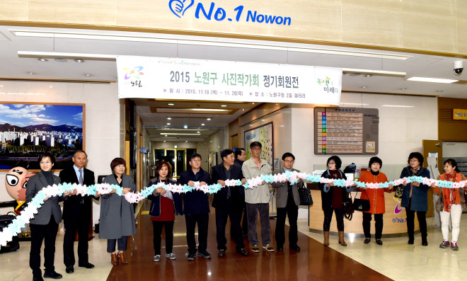 노원구는 지난 19일 오후 6시 구청 1층 현관에서 '2015 노원사진작가회 정기전'을 개최했다. 사진은 이날 행사에 참석한 김성환 구청장(왼쪽에서 다섯 번째)이 작품을 전시한 사진작가, 내빈들과 함께 테이프 커팅을 하고 있는 모습.(사진제공=노원구청)