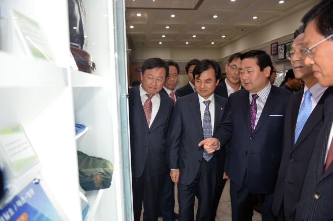 동대문구가 최근 구청 로비에서 '동대문구 소상공인회 홍보전시관 개관식'을 개최한 가운데 김봉식 동대문구 소상공인회 회장(오른쪽에서 두 번째) 등 관계자들이 전시품목을 살펴보고 있다.(사진제공=동대문구청)