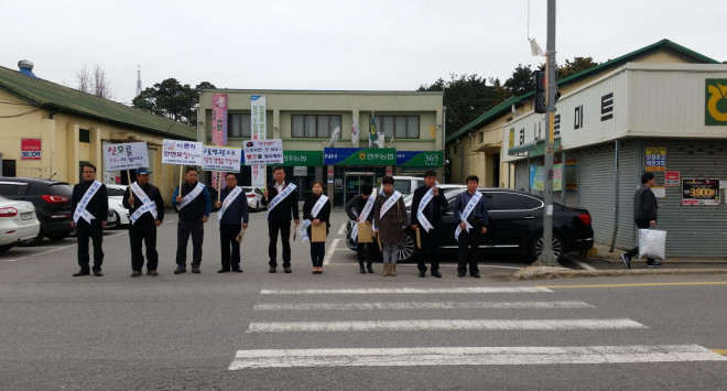 최근 충남 아산시 인주면주민자치위원들이 인주농협삼거리에서 주민들의 ‘교통질서 준수’ 의식을 높이고 변경된 신호체계를 알리기 위해 피켓을 들고 캠페인을 펼치고 있다.(사진제공=아산시청)