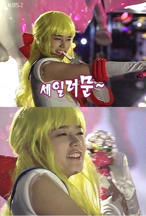 한가인은 당시 방송에서 만화속 캐릭터 세일러문과 똑같은 분장을 하고 환한 미소를 짓고있다.