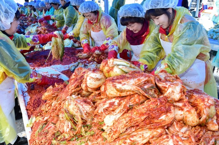 경기 수원시종합자원봉사센터는 최근 센터 주차장 앞마당에서 자원봉사자와 함께 경기사회복지공동모금회가 지원하는 '2015 사랑의 김장 나눔' 행사를 진행했다. 사진은 행사에 참석한 관계자들이 김치를 담그는 모습.(사진제공=수원시청)