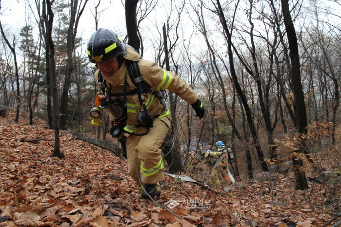 서울 동작소방서는 지난 23일 오후 2시 동작구 국사봉 인근 산에서 소방대원 20여명과 의용소방대 20여명, 자위소방대 20여명 등이 참석한 가운데 '가을철 산불예방 훈련 및 캠페인'을 실시했다. 사진은 산불예방 훈련이 진행 중인 모습.(사진제공=동작소방서)