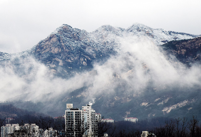 강원도에 대설경보가 내린 25일 오전 서울 은평구 구산동 경향파크아파트에서 바라본 북한산에 첫눈이 내려 의상능선 일대가 운해와 함께 어우러져 아름다운 자태를 보여주고 있다.