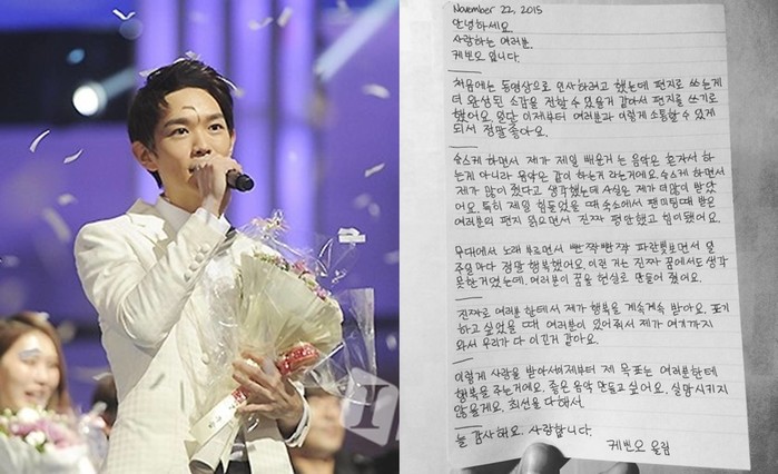 손편지를 통해 그는 "사랑하는 여러분, 케빈오입니다"라며 "편지로 쓰는 게 더 완성된 소감을 전할 수 있을 것 같다"고 입을 뗐다.