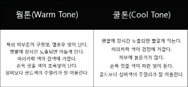 피부톤에는 크게 '웜톤'과 '쿨톤'으로 나뉘는데 구분하는 법은 아주 간단하다. 본인의 피부톤이 웜톤인지 쿨톤인지 먼저 파악한다면 색조 화장품이나 액세서리를 고를 때 유용하다는 게 전문가들의 설명이다.