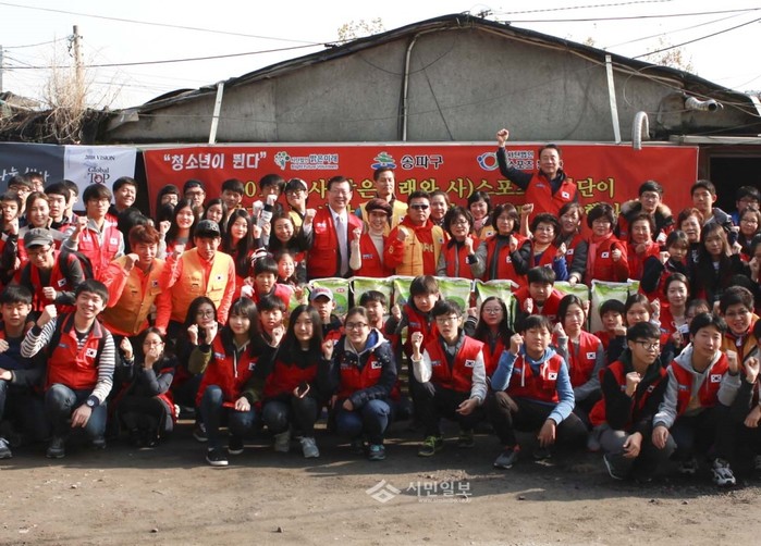 서울 송파구 청소년봉사단체인 사단법인 밝은미래는 지난 21일 문정동 화훼마을을 방문해 ‘사랑의 연탄배달’ 행사를 개최했다. 사진은 행사에 참석한 관계자들이 기념촬영을 한 모습.(사진제공=송파구청)