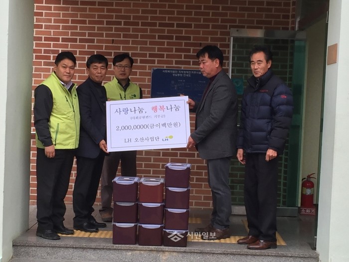 한국토지주택공사(LH)경기지역본부 오산사업단 직원일동은 지난 25일 오산시 소재 성심재활원을 방문해 후원금 200만원과 김장김치 50kg을 전달했다. 사진은 전달식에 참가한 관계자들이 기념촬영을 한 모습.(사진제공=오산시청)