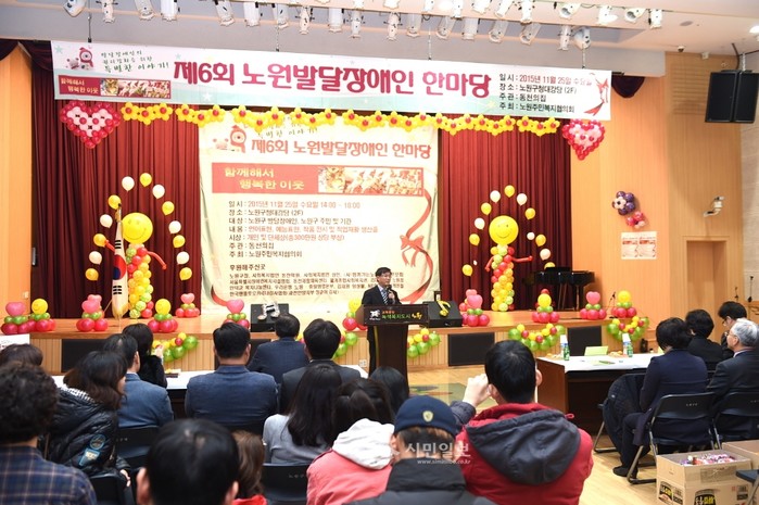 노원구가 지난 25일 오후 2시 구청 2층 대강당에서 ‘제6회 발달장애인 한마당’을 개최해 김성환 노원구청장이 행사에 참석, 인사말을 하고 있다.(사진제공=노원구청)