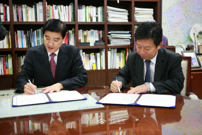 이해식 강동구청장(왼쪽)은 지난 23일 오후 3시, 구청장 집무실에서 대한민국건강도시협의회 의장으로서 '대한민국건강도시협의회-건강도시 및 범정책건강 WHO 협력센터 간 양해각서(MOU)'를 체결했다.(사진제공=강동구청)