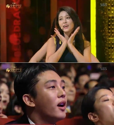 이날 자리에 참석해 앉아있던 유아인은 설현이 속한 AOA의 축하무대 '심쿵해'를 보며 노래를 따라부르는가 하면, 흐뭇하게 그들을 바라보는 모습으로 시청자들로부터 많은 관심을 모은 것.