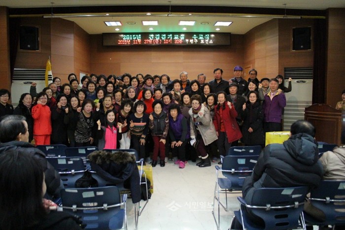 인천 부평구보건소는 구민의 건강생활실천 사업의 일환으로 올해 실시한 ‘건강걷기교실’을 마감하며 지난 27일 오전 수료식을 열었다. 사진은 수료식에 참석한 관계자들이 기념촬영을 한 모습.(사진제공=부평구청)