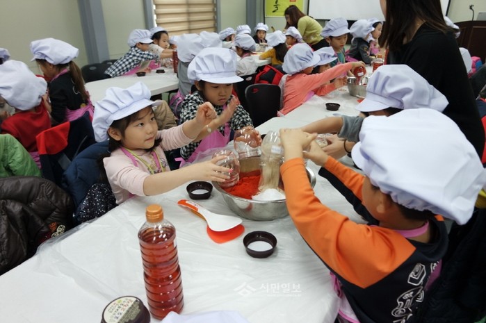 오는 12월4일까지 경기 안산시 학교급식지원센터가 대부도 상록수 된장마을에서 실시하는 ‘로컬푸드를 이용한 전통 장 담그기교육’에 참석한 아이들이 강사의 지도에 따라 고추장에 들어가는 재료들을 한데 섞고 있다.(사진제공=안산시청)
