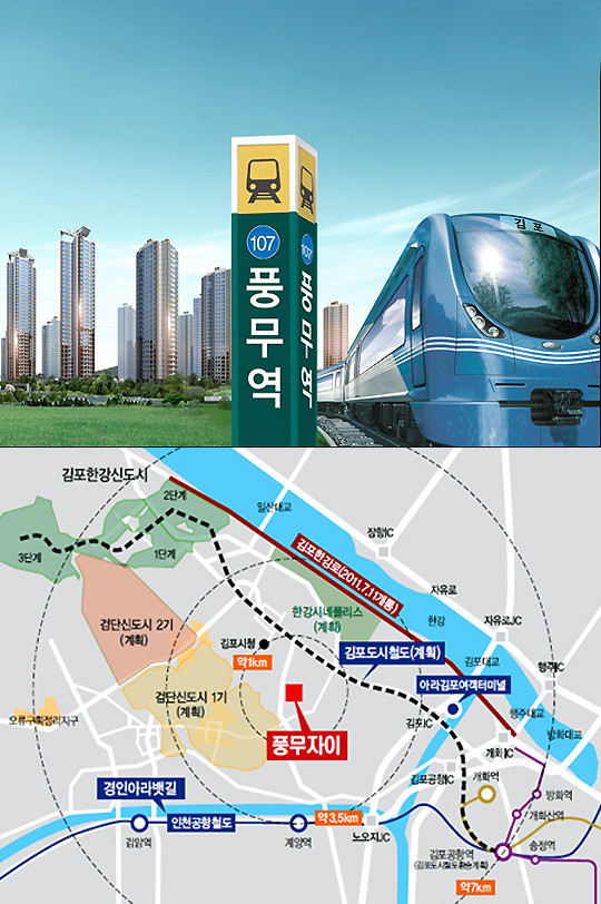 ‘김포 풍무자이’는 김포공항역에서 두번째역 풍무역과 인접하여김포공항역까지 5분 정도 소요되며, 김포공항역에서 인천공항철도, 9호선, 5호선과 환승 가능하여 김포도시철도 개통의 최대 수혜 아파트로 꼽히고 있다.
