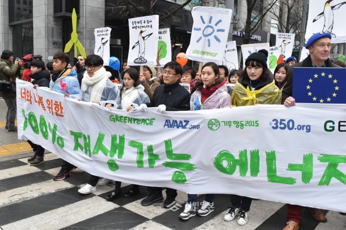 김성환 서울 노원구청장(오른쪽에서 네 번째)이 지난 29일 청계광장에서 열린 ‘세계시민과 함께하는 기후행진 서울 2015’ 행사에 참석해 시민들과 함께 청계2가 사거리를 반환점으로 하는 행진을 하고 있다.(사진제공=노원구청)