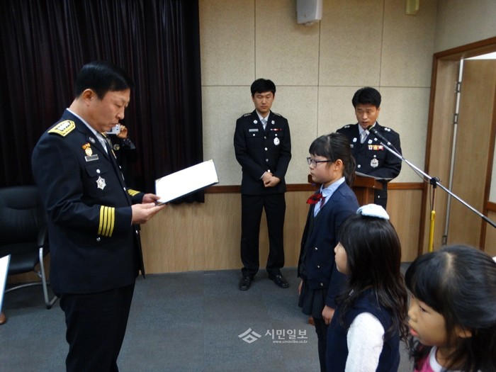 세종시 조치원소방서가 30일 소방서에서 '2015년 불조심 우수작품 공모전 시상식'을 개최했다. 사진은 시상식에 참석한 임동권 서장이 이번 대회에서 입상한 어린이들에게 상장을 수여하는 모습.(사진제공=세종시청)