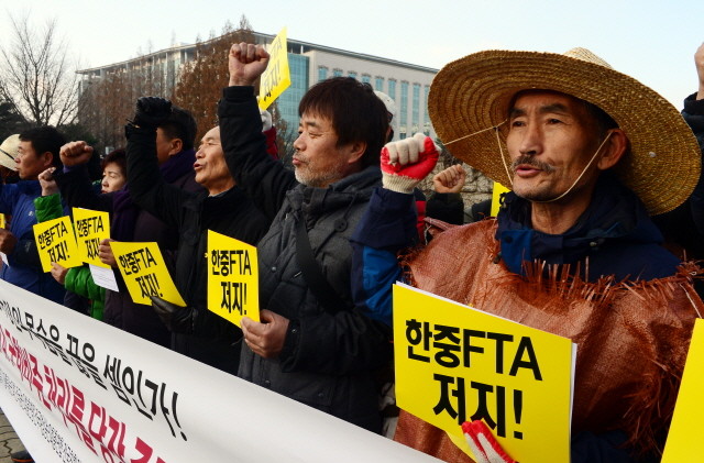 30일 오전 서울 영등포구 여의도 국회 앞에서 열린 '한중 FTA 국회비준 반대 농민 기자회견'에서 전국농민회총연맹 등 농민단체 회원들이 한중FTA 국회비준 반대 구호를 외치고 있다.