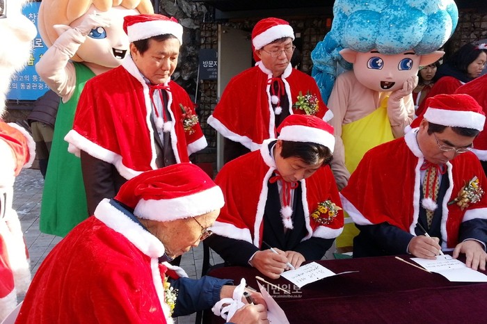 1일 경기 광명동굴에서 열린 '2015 광명동굴 Happy Christmas 개장식'에 참석한 양기대 광명시장(오른쪽)과 나상성 광명시의회 의장(가운데)이 산타복을 입고 해피카드에 소원을 기록하고 있다.(사진제공=광명시청)