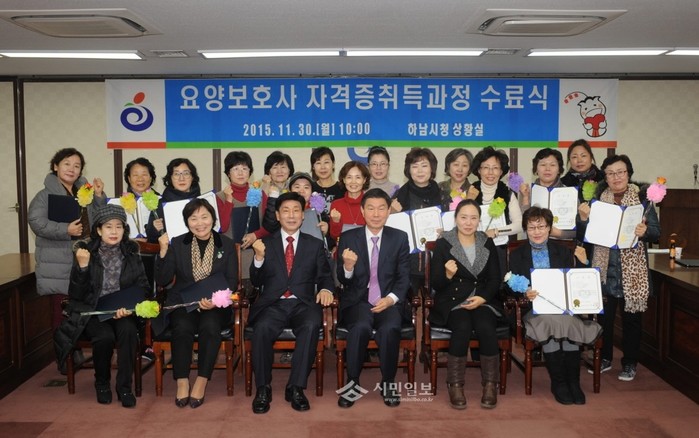 경기 하남시는 지난달 30일 시청 상황실에서 '요양보호사 자격증 취득과정 수료식'을 개최했다. 사진은 행사에 참석한 관계자들이 수료식이 끝난 후 기념 촬영을 한 모습.(사진제공=하남시청)