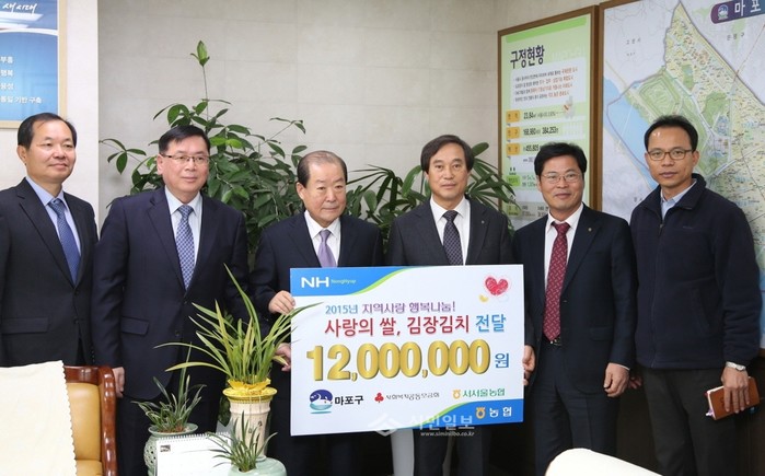 서울 마포구는 최근 구청 접견실에서 '사랑의 쌀과 김장김치' 전달식을 진행했다. 사진은 박홍섭 구청장(왼쪽에서 세 번째)이 서서울농협 조원민 조합장(오른쪽에서 세 번째)과 기념촬영하고 있는 모습.(사진제공=마포구청)