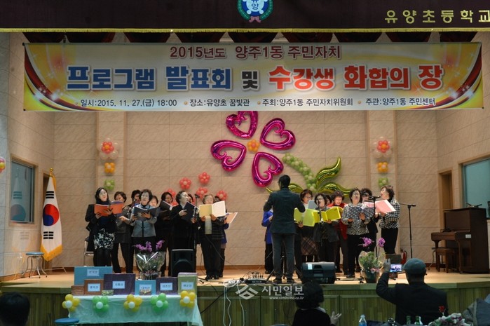 경기 양주시 양주1동 주민자치위원회는 최근 유양초등학교 꿈빛관에서 ‘2015년도 양주1동 주민자치 프로그램 발표회’를 개최했다. 사진은 행사에 참가한 관계자들이 노래를 부르는 모습.(사진제공=양주시청)