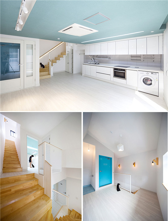 1층에서는 남쪽으로 테라스를 내고, 2층 침실의 남측 사선 면에는 공간 낭비를 줄이기 위해 침대 겸 수납 겸 침대 사이드 및 책상의 역할을 할 수 있는 가구를 특별히 디자인했다. 3층은 안방 공간으로 드레스룸과 함께 독립된 화장실을 계획하였고, 4층은 사선지붕의 매력을 살린 높은 층고의 사선 공간을 계획했다. 4층 방에서 이어지는 옥상은 4개의 사선매스가 얹혀있는 형태인데 여기에서도 두 가지 다른 색상의 지붕재를 번갈아 사용하여 각기 같은 듯 다른 느낌을 가질 수 있도록 했다.
