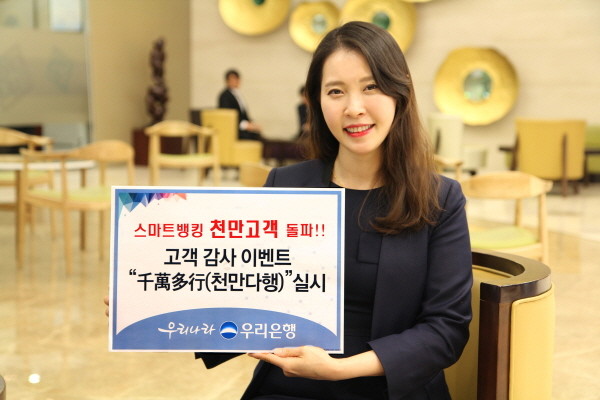이에 우리은행은 스마트뱅킹 서비스가 처음 출범된 2010년을 기념해 총 2010명 고객에게 다양한 경품을 제공하는 '천만고객이 행복해지는 千萬多幸(천만다행) 감사 이벤트'를 3일부터 오는 2016년 1월말까지 2개월간 실시한다.
