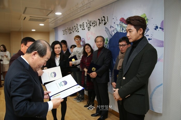 서울 마포구는 최근 상암동에 소재한 구립마포청소년문화의집에서 '2015 청소년 진로 멘토 감사의 자리'를 개최했다. 사진은 박홍섭 마포구청장이 탤런트 이태성씨에게 감사장을 수여하는 모습.(사진제공=마포구청)