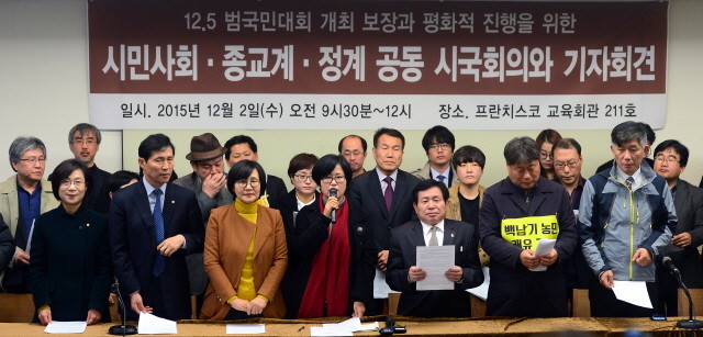 김금옥(왼쪽 네 번째)시민사회단체연대회의 공동대표가 2일 오전 서울 중구 프란치스코 교육회관에서 열린 ‘12.5 범국민대회 개최보장과 평화적 진행을 위한 시민사회·종교계·정치권 시국회의 및 기자회견’에서 발언을 하고 있다.