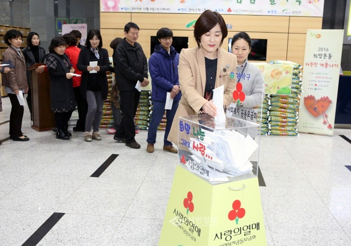 지난 2일 서울 관악구 '2016 희망온돌 따뜻한 겨울나기' 사업의 일환으로 구청 1층에 '사랑의 성금 모금함'을 설치한 가운데 주민과 구청직원들이 성금을 내기 위해 줄을 서고 있다. (사진제공=관악구청)