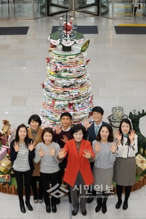 지난 2일 박춘희 서울 송파구청장이 구청사 로비에 직원들이 기부한 800여권의 책으로 완성된 ‘책트리 점등식’에 참석해 직원들과 기념촬영을 하고 있다. 책트리는 전시가 끝나면 지역내 작은도서관에 기부될 예정이다.(사진제공=송파구청)