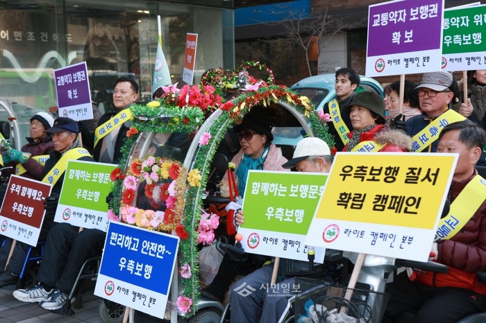 지난 1일 서울 강북구청 사거리 일대에서 서울시지체장애인협회 주최로 장애인보행권 확보를 위한 '우측보행질서 확립 캠페인'이 펼쳐진 가운데 참가자들이 구호를 외치며 홍보활동을 펼치고 있다. (사진제공=강북구청)