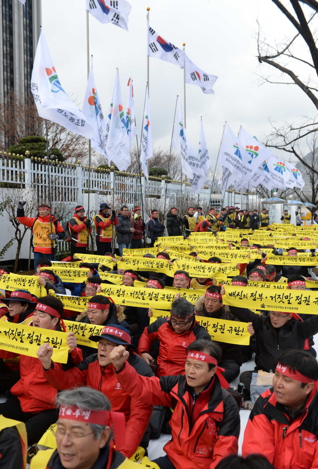 3일 오후 서울 종로구 세종대로 정부서울청사 앞에서 열린 원칙과 약속을 저버린 대정부 투쟁 출정식에서 대한민국공무원노동조합총연맹 회원들이 피켓을 들고 구호를 외치고 있다.