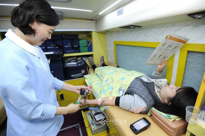 지난 3일 서울 송파구의 안정적 혈액 공급을 위해 실시하는 '사랑의 헌혈'에 참가한 한 구청 직원이 주차장에 마련된 대한적십자사 남부혈액원의 헌혈버스에서 헌혈을 하며 안내 책자를 읽고 있다.(사진제공=송파구청)